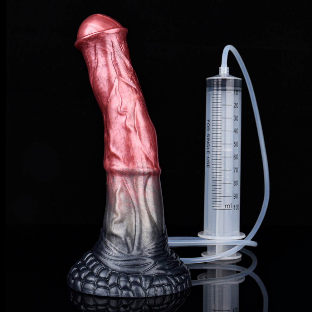 The Squirting Friesian Horse Dildo is a dildo coloured in Nightmare Saddle, a glossy black and red gradient. This horse inspired dildo features a prominent ring marking the shaft and a cumtube to simulate ejaculation. This dildo is perfect for men and women that can't get enough equine pleasure in their lives!