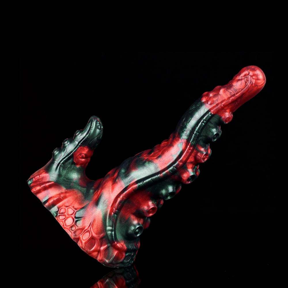 The Abyss Tentacles Dildo is a dildo coloured in Chaotic Temptation, an erratic blend of red and black shades. This tentacle inspired dildo features two shafts, one notably longer and thicker than the other, both complete with suction cup detailing. The gap between the two shafts is generous enough that you can comfortably enjoy a single tentacle at a time while working your way to taking both.