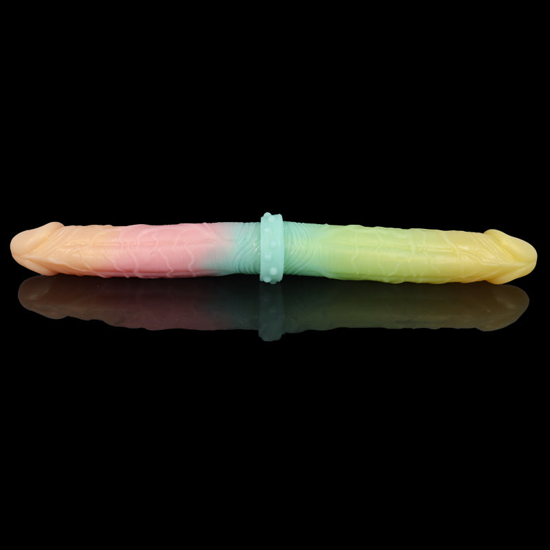The Veined Duo Dildo is a double ended dildo coloured in Pastel Fantasy, a vibrant pastel gradient. Both ends of this dildo feature veining along the shafts to enhance pleasure. This dildo is perfect for playing alone or for sharing with a partner.